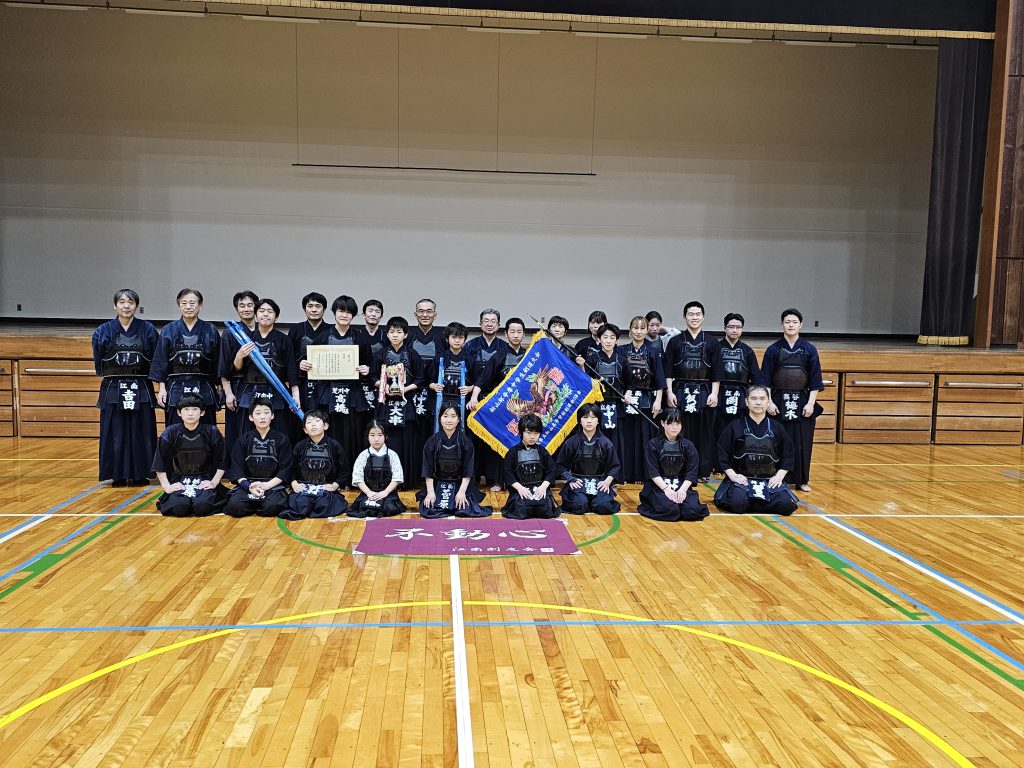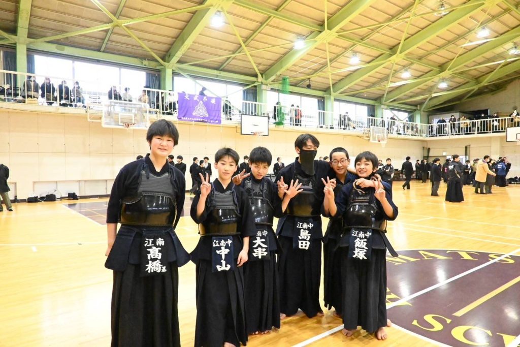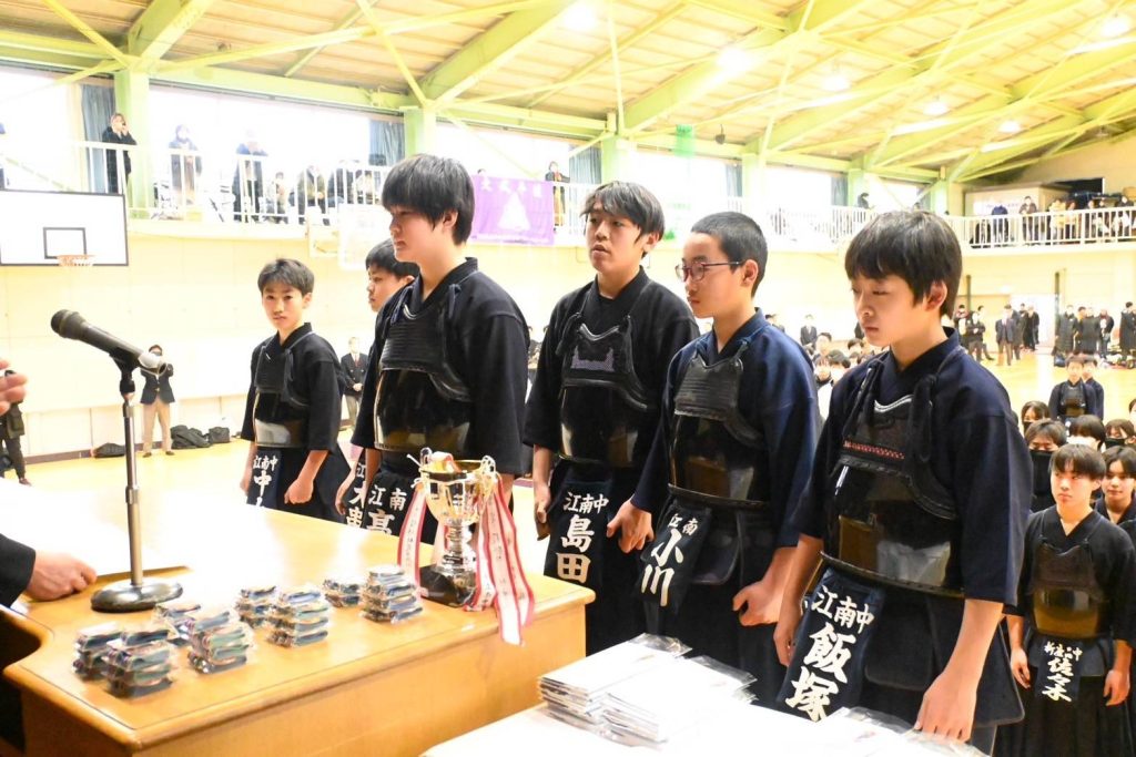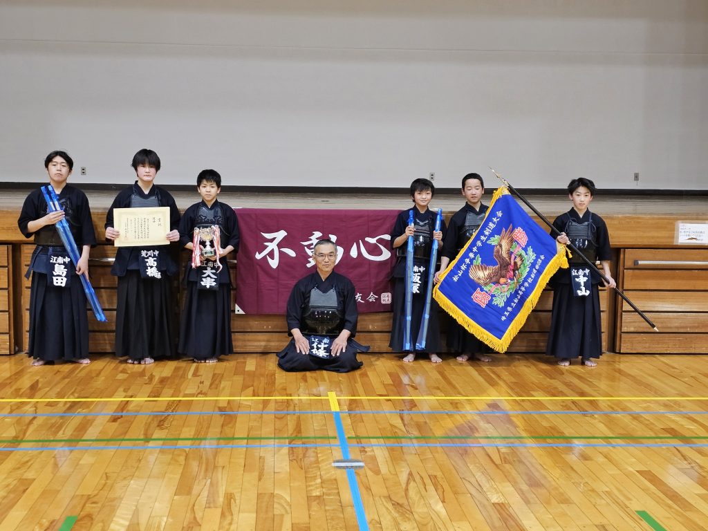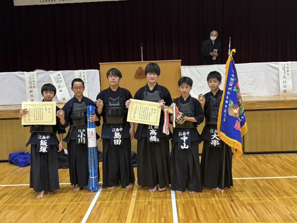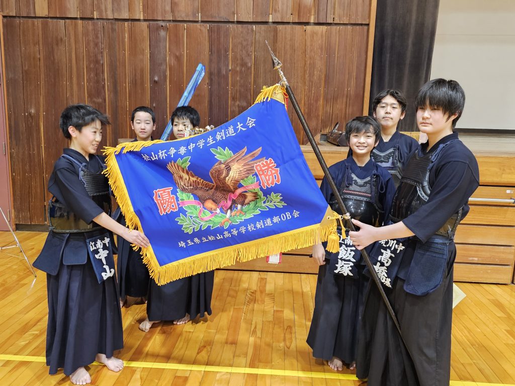 2025年2月2日(日)に、仲條先生の母校である 埼玉県立松山高等学校 剣道部主催の「松高杯」に我江南剣友会中学生が初めて参加しました。Cブロックをトップで勝ち抜きBブロックと対戦し勝利、そして決勝へ進みました。相手は強豪校である新座第二中学、結果はなんと初出場、初優勝となり素晴らしい結果でした。 中学生頑張りました、おめでとう! 仲條先生は決勝中、優勝が近づくにつれ目が潤んでおり、大泣きでした。松山高校OBとして、嬉しかったのですね、おめでとうございました。また改めて江南剣友会の中で3月1日に仲條先生より表彰していただきました。